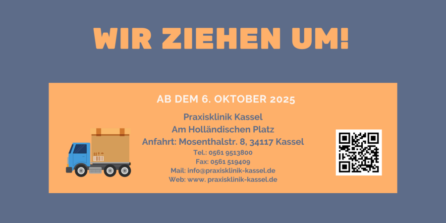 wir sind mitten in den Umzugsarbeiten, daher ist unsere Praxis am Standort Kassel, Forstbachweg nun geschlossen. Ab dem 6. Oktober 2025 sind wir in unseren neuen Praxisräumen wieder für Sie da.